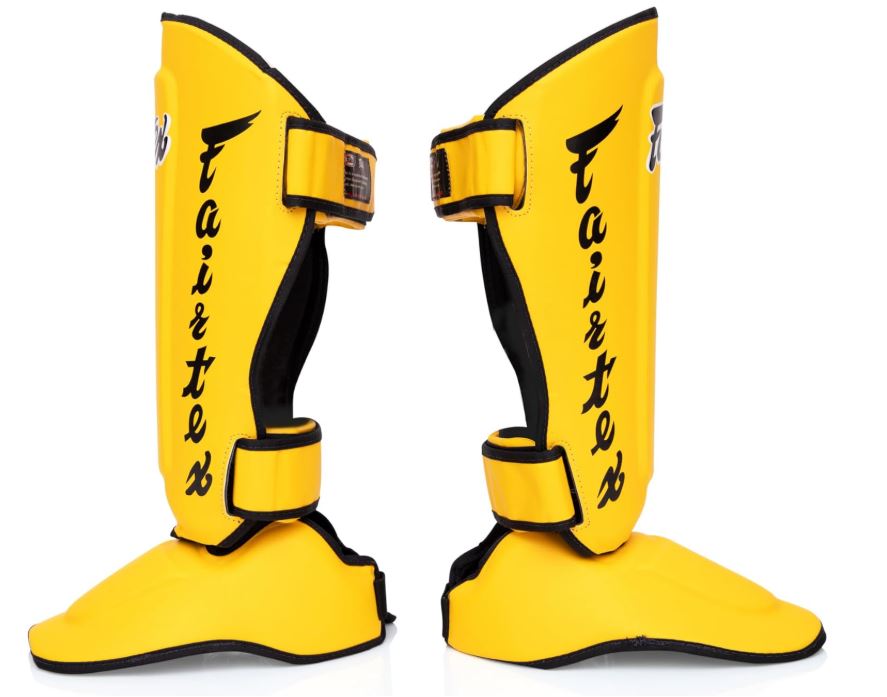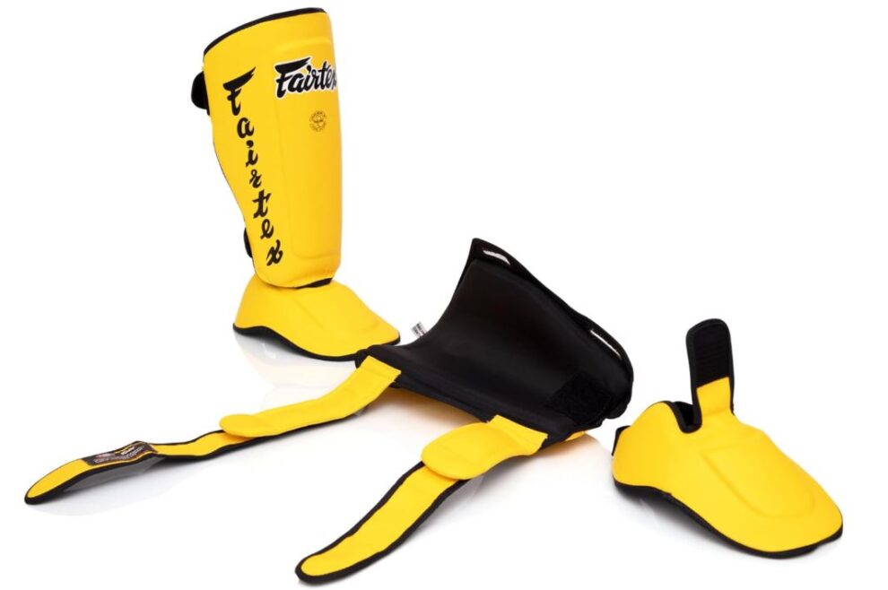 Protège-tibias et protège-pieds FAIRTEX détachables, s’adaptant à chaque utilisateur et à tous les usages (entraînement, sparring, compétition) en Muay Thai, kickboxing et MMA.