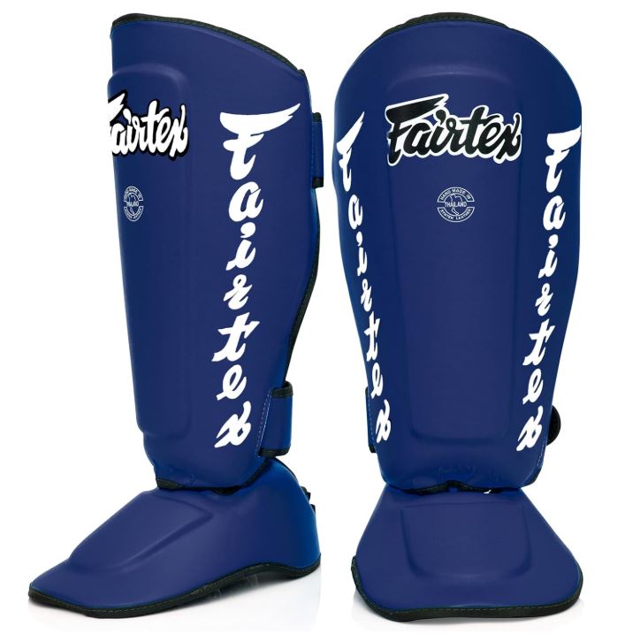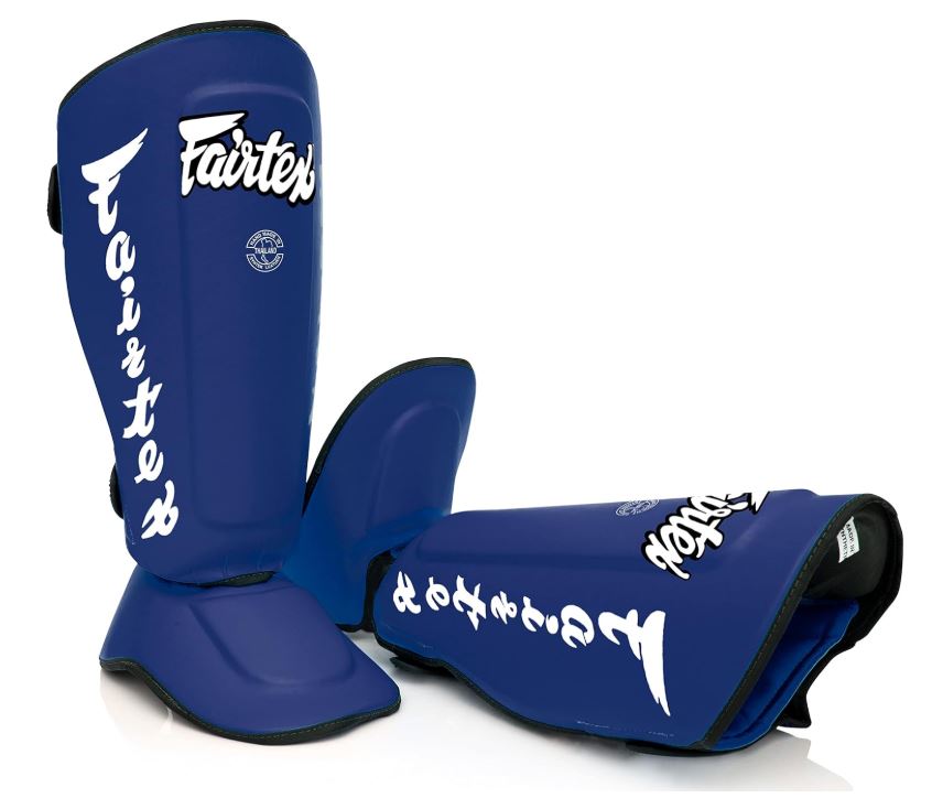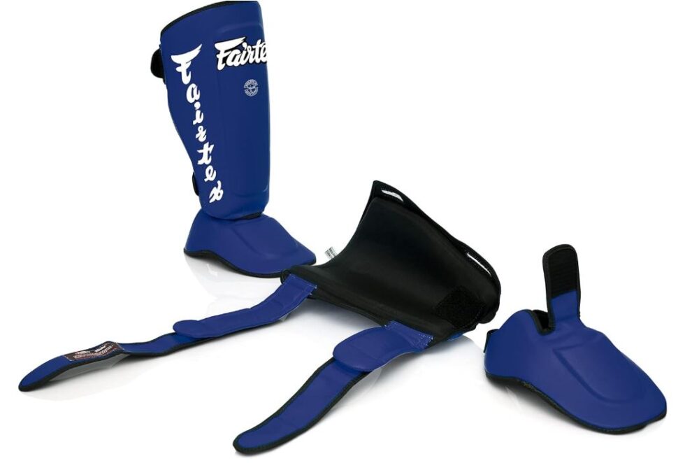 Protège-tibias et protège-pieds FAIRTEX détachables, s’adaptant à chaque utilisateur et à tous les usages (entraînement, sparring, compétition) en Muay Thai, kickboxing et MMA.