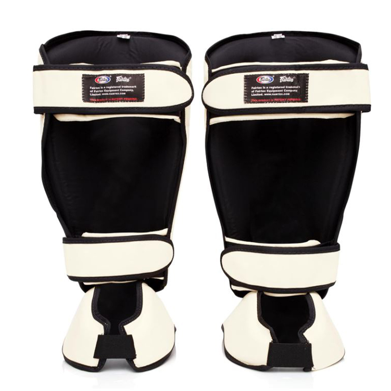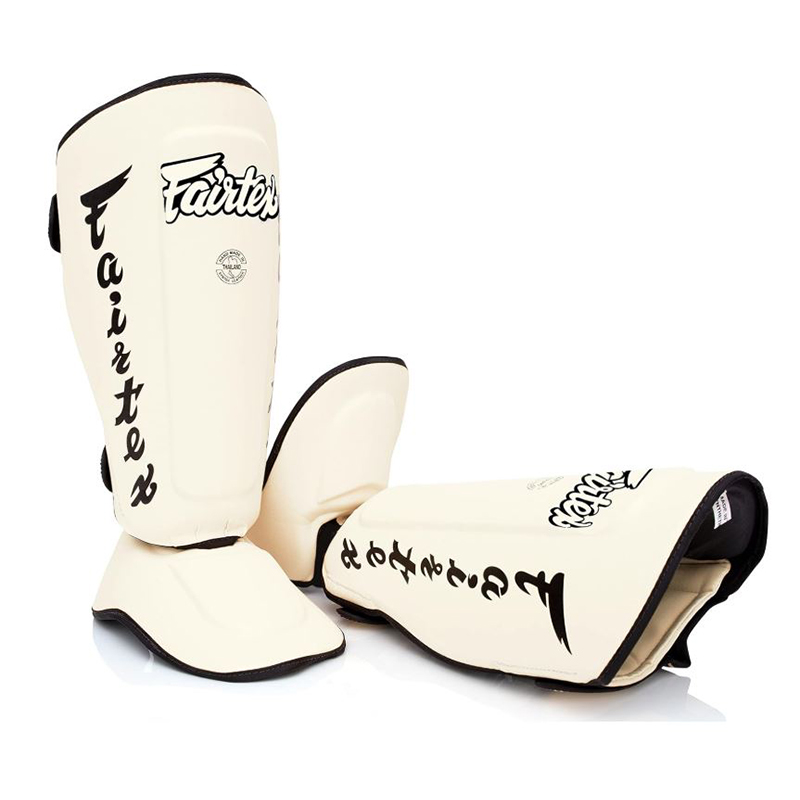 Protège-tibias et protège-pieds FAIRTEX détachables, s’adaptant à chaque utilisateur et à tous les usages (entraînement, sparring, compétition) en Muay Thai, kickboxing et MMA.