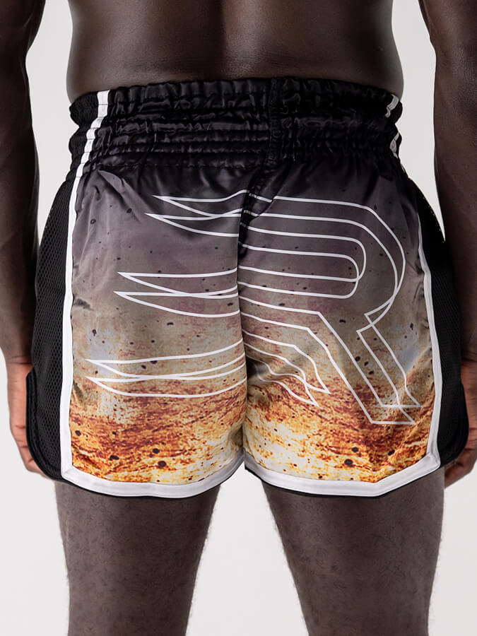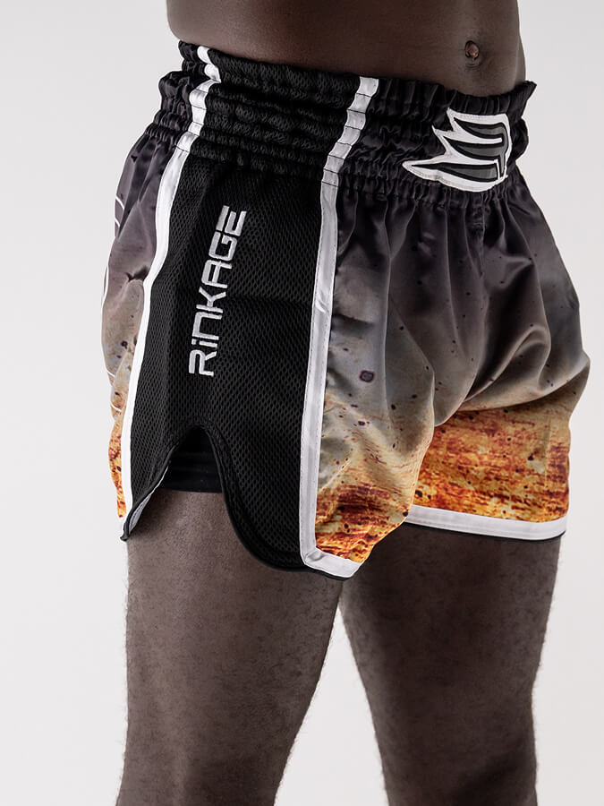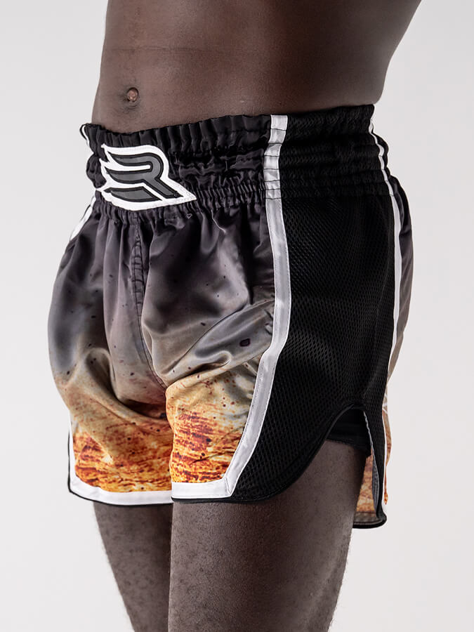 Inspiré des shorts traditionnels, sa coupe ample et ses fentes latérales généreuses libèrent les high kicks, middle, low kicks et les genoux sans aucune entrave.