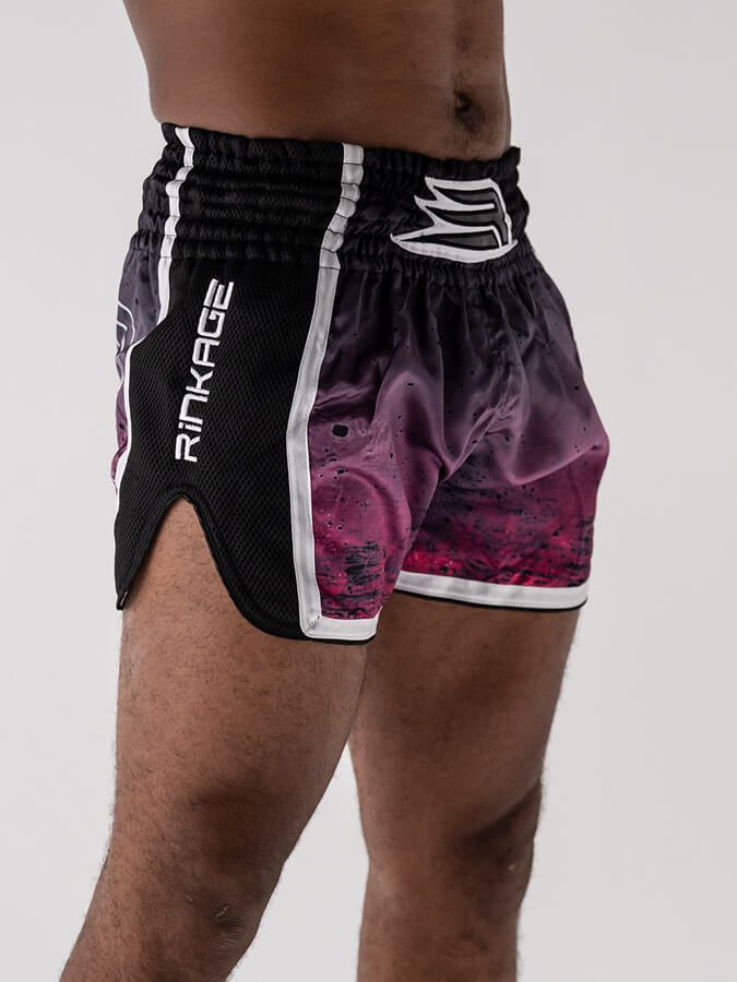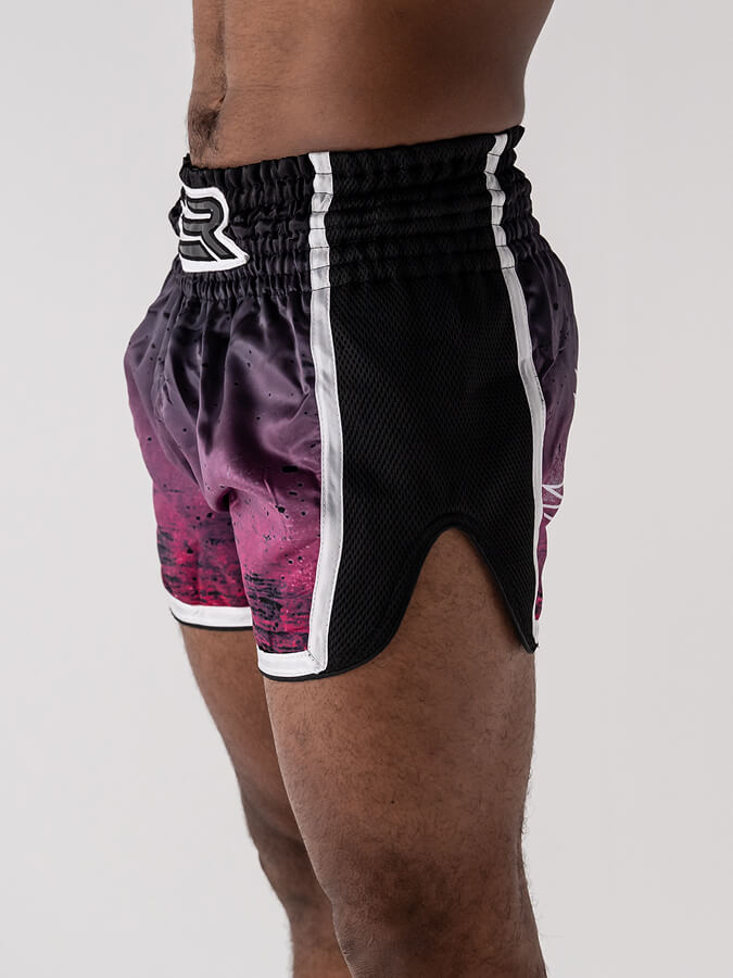 Inspiré des shorts traditionnels, sa coupe ample et ses fentes latérales généreuses libèrent les high kicks, middle, low kicks et les genoux sans aucune entrave.